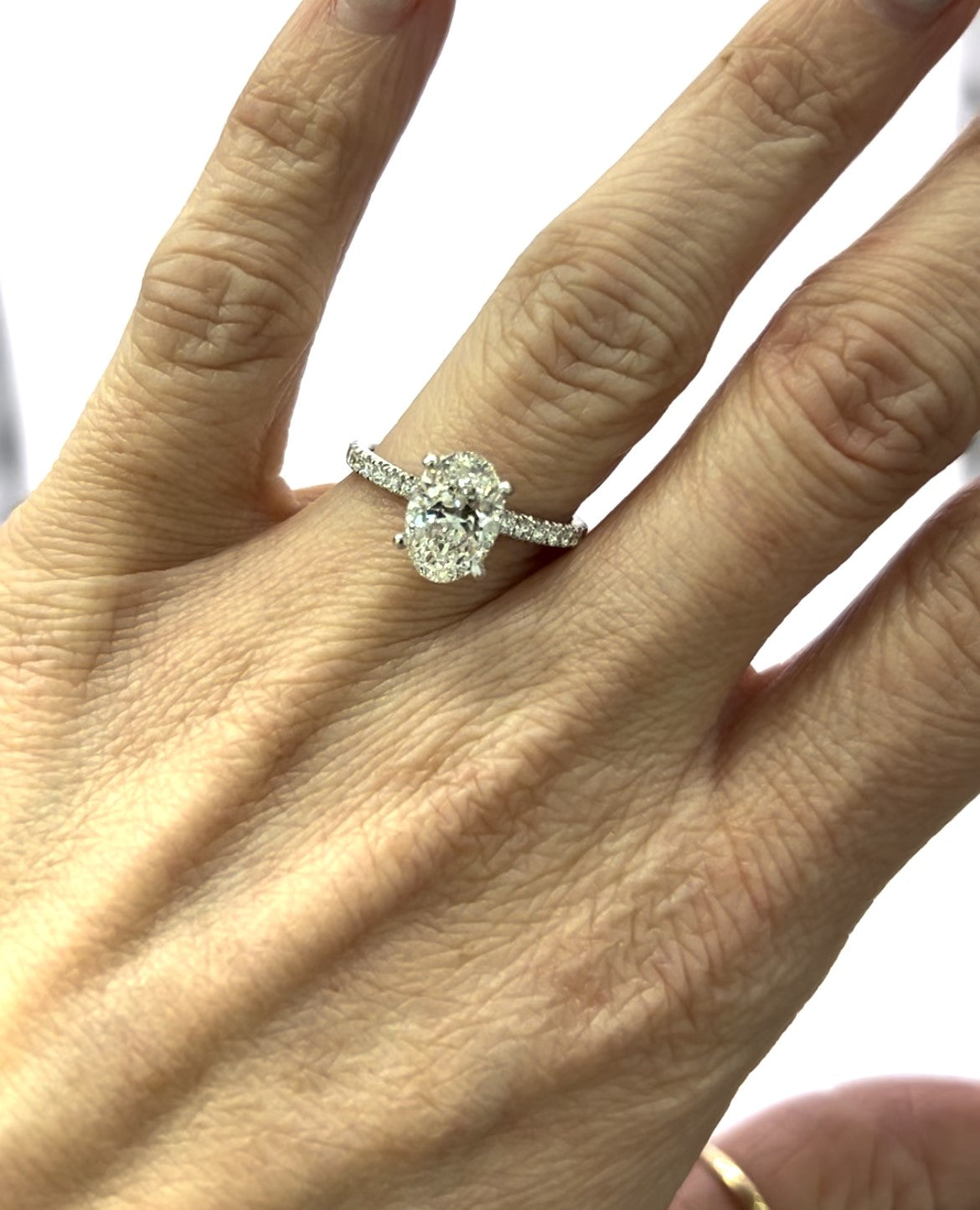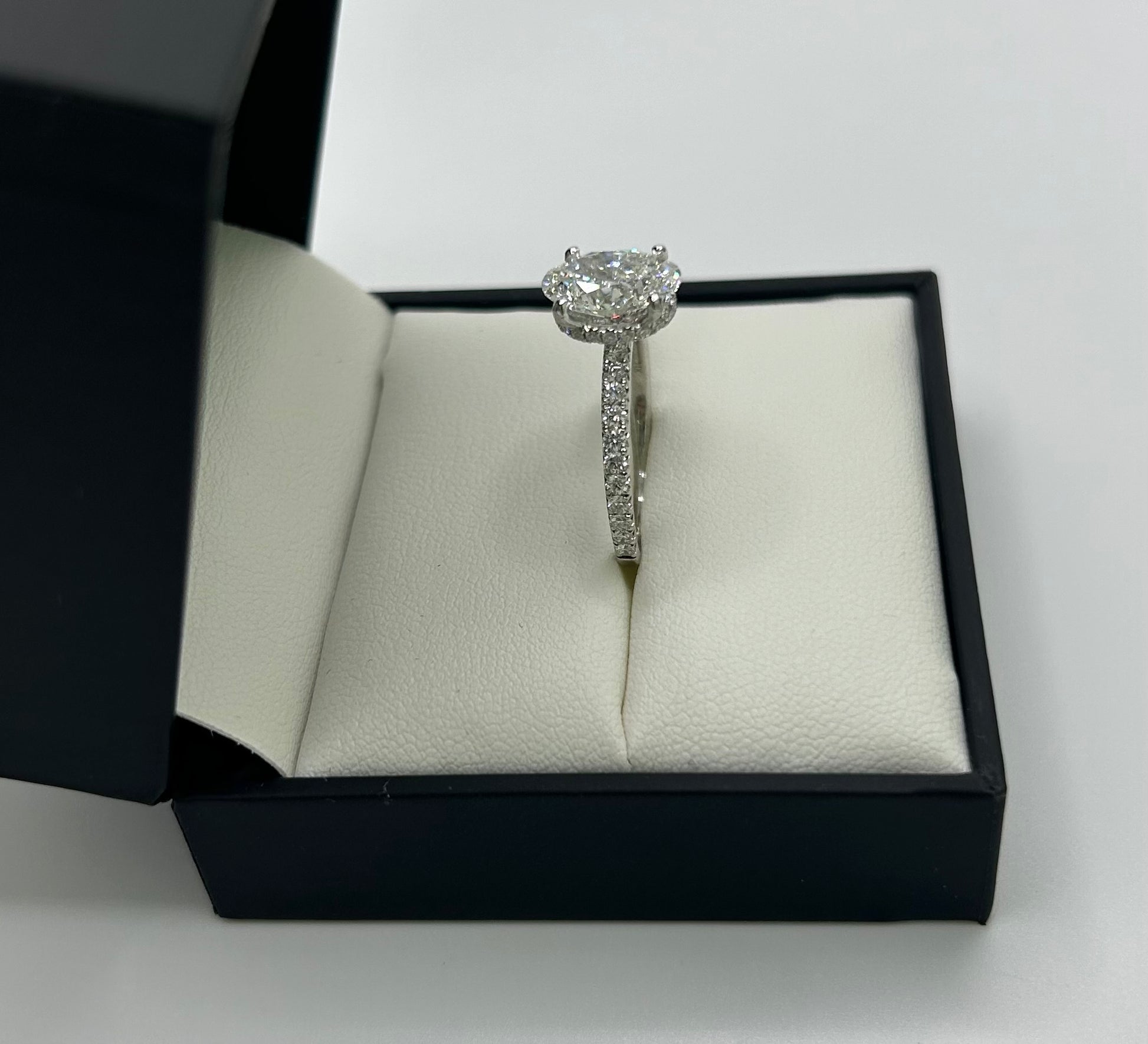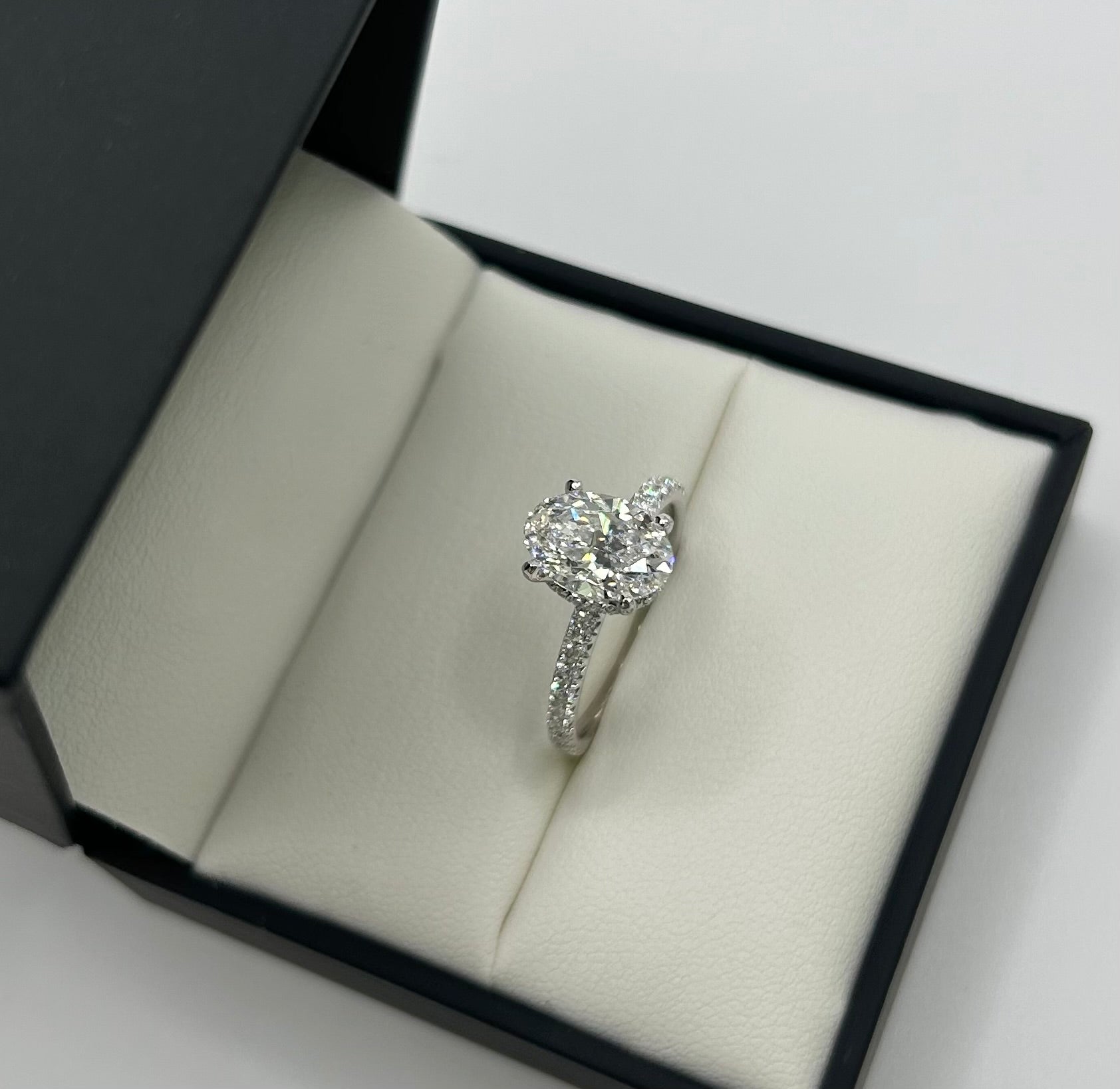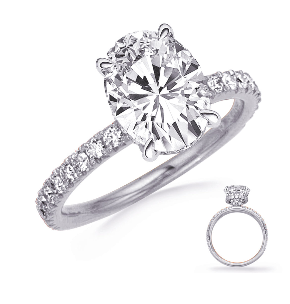 WE love the small details!! 14kt white gold ring containing 1 2ct oval lab grown diamond in a hidden halo setting .54ct round natural diamonds on the ring! Available in yellow gold!