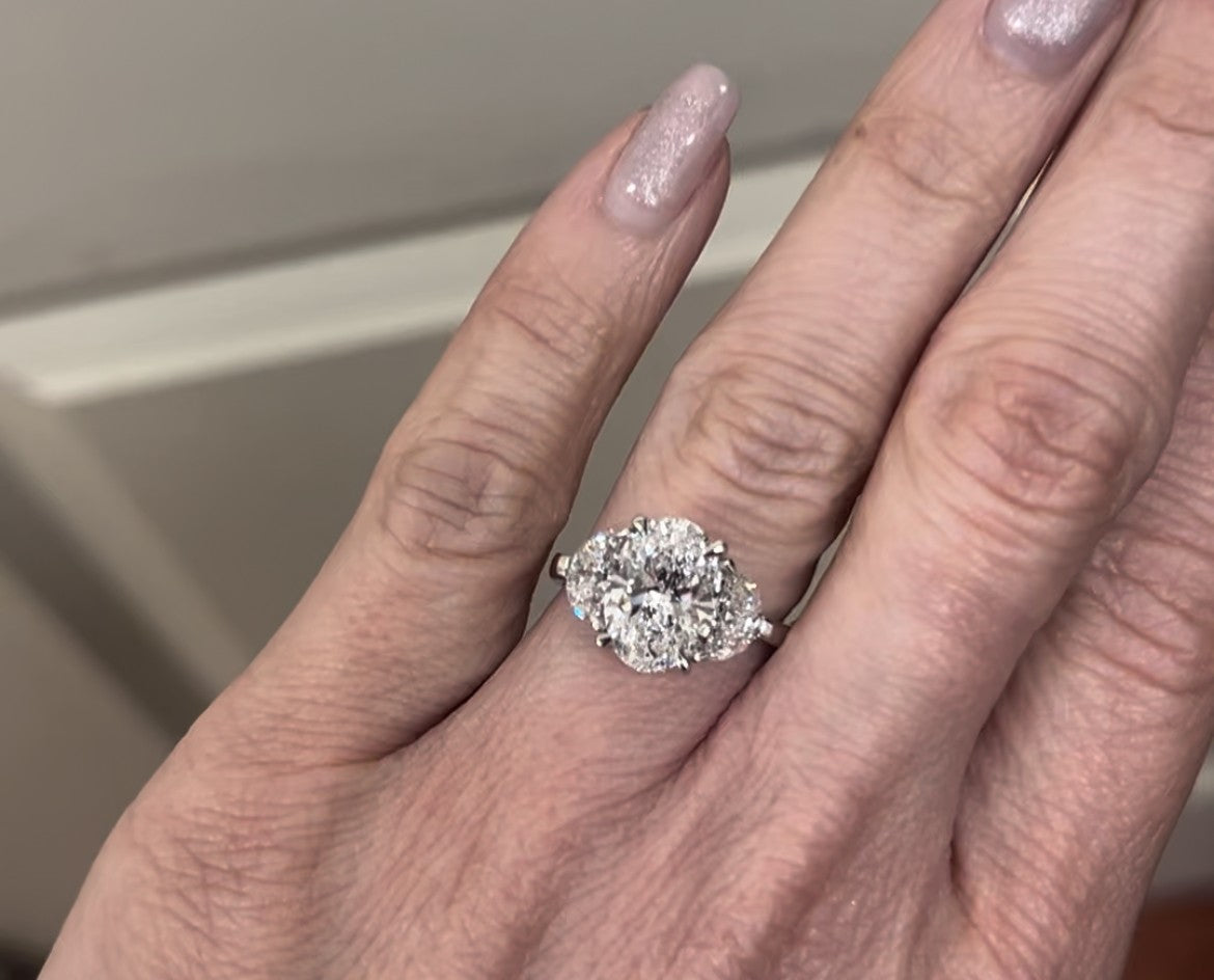 Beautiful 3 stone Lab Grown Diamond Engagement Ring. 3ct Oval Center; Side Half Moon Diamonds are .52ct each 1.05ctw.