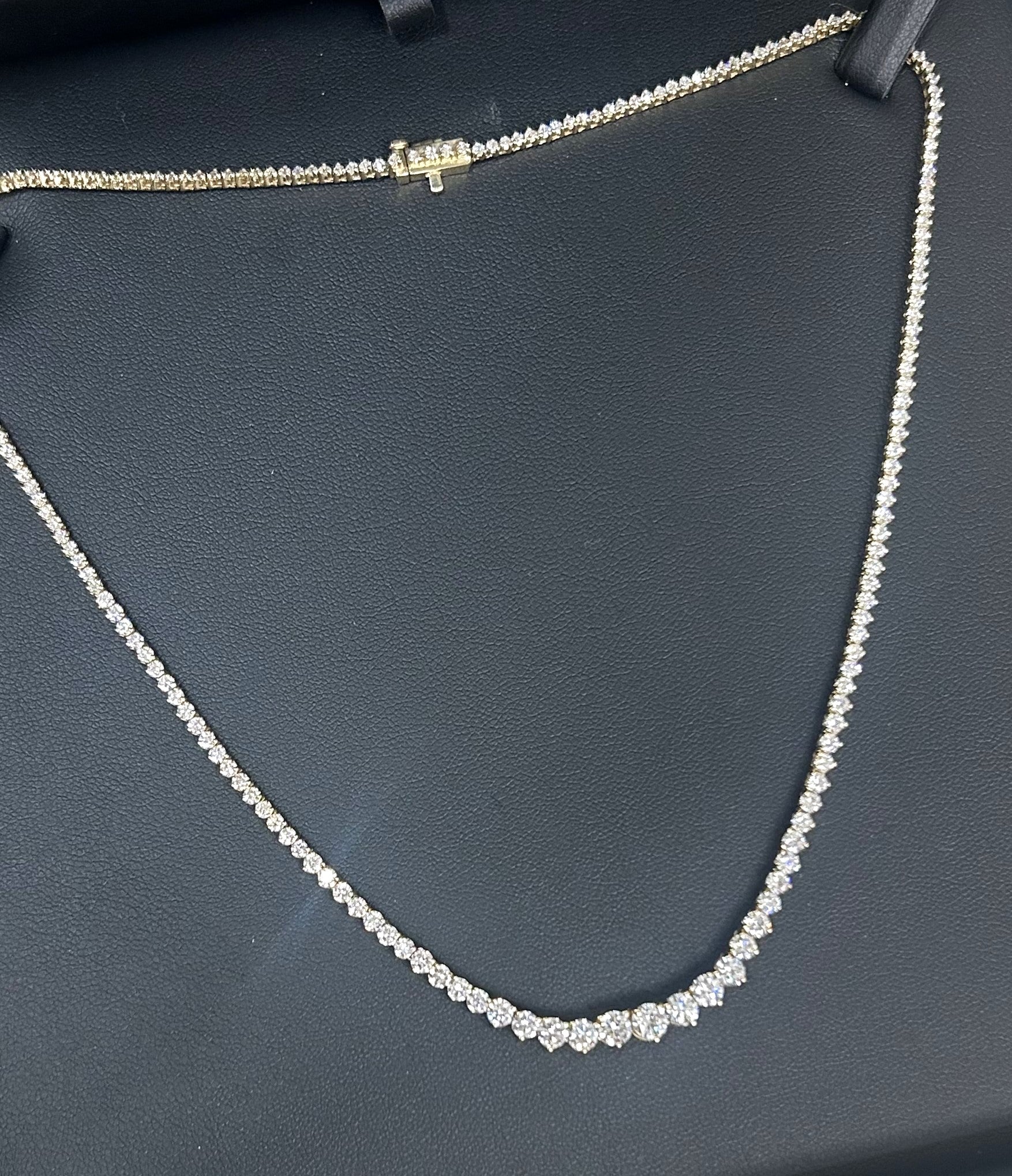 Yes, this necklace is gorgeous and you need it! If you love diamonds this one is for you! 8ctw of lab diamond color G, clarity SI1 set in 14kt yellow gold 16.5in long.